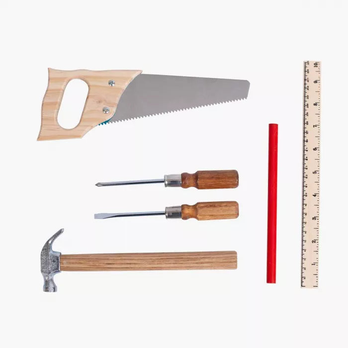 Una sierra, un martillo, dos destornilladores, regla y lápiz de carpintero... herramientas casi iguales a las de mamá.