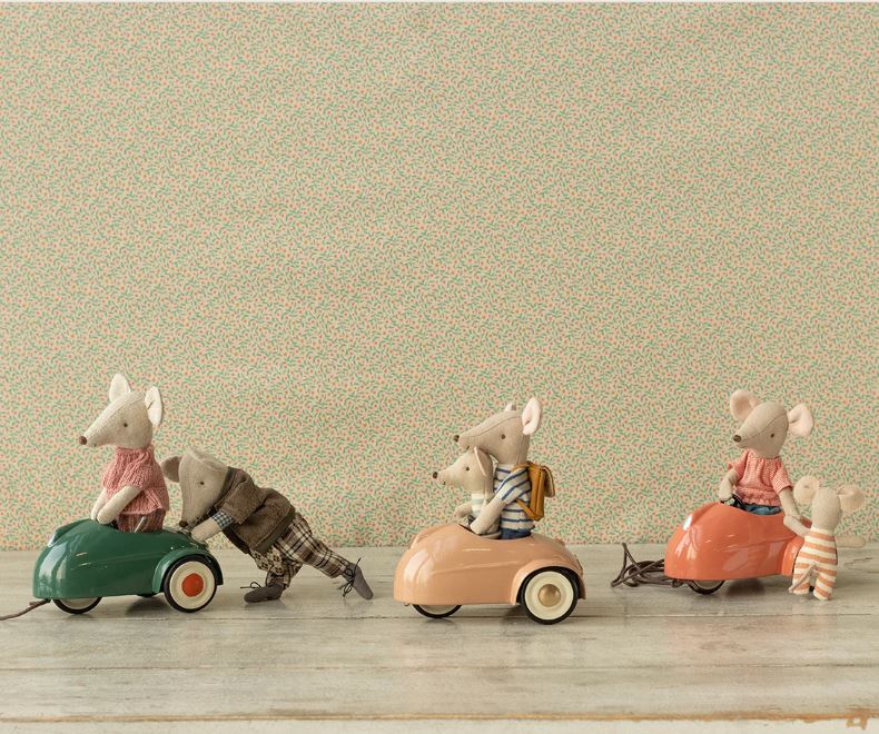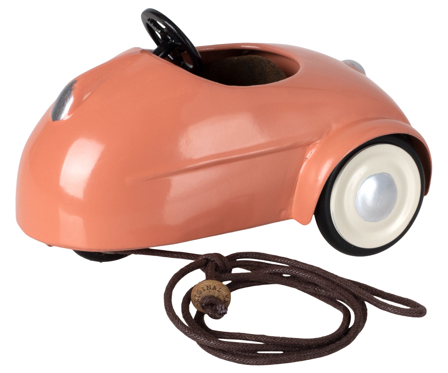 El coche de metal es un transporte perfecto para cualquier ratón. Se adapta a todos los ratones de la talla hermano/a pequeño/a, hermano/a mayor y mamá/papá. La cuerda incluida se puede amarrar debajo del coche para que el niño tire del mismo.