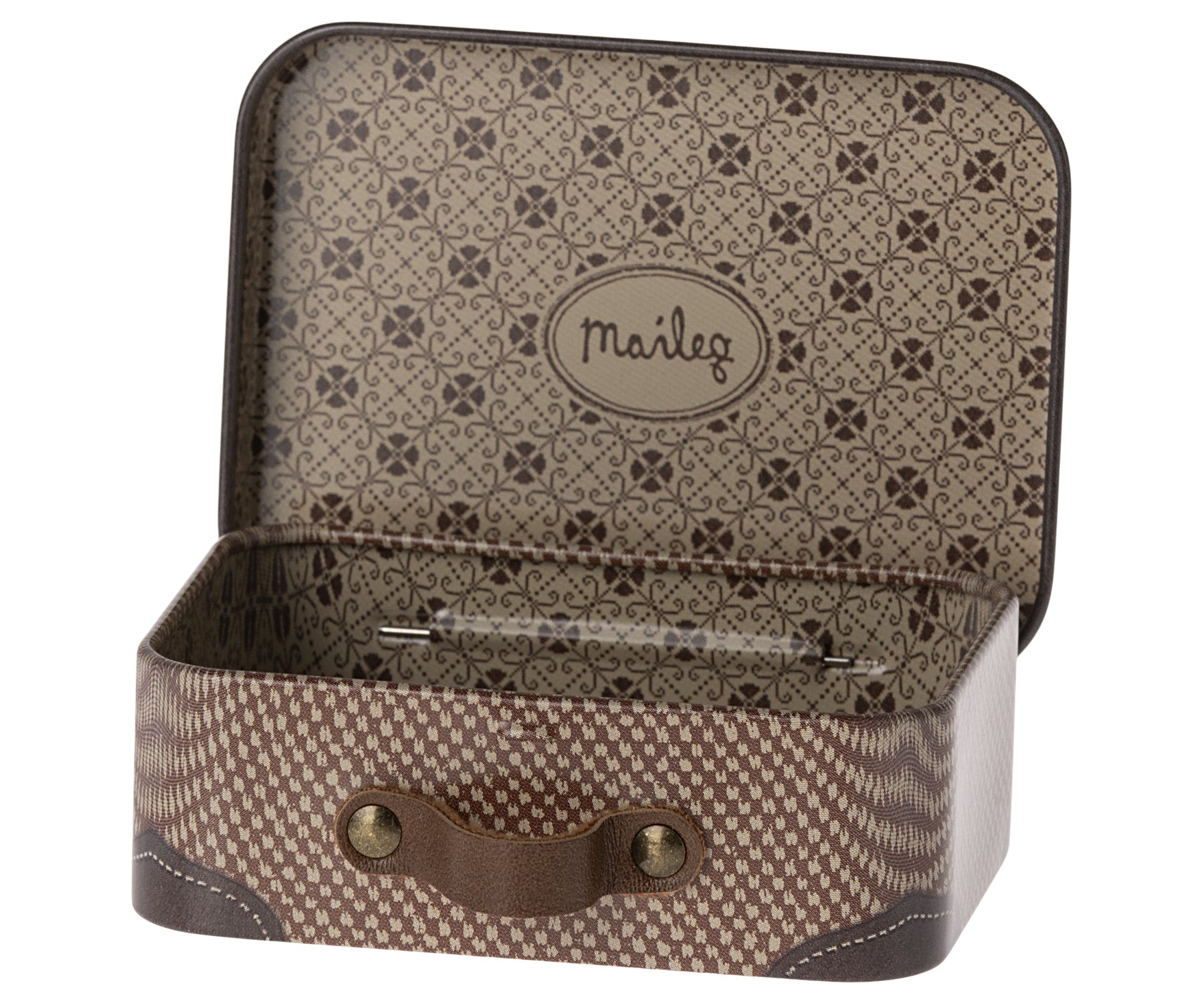 Puede que no lo sepas, pero los ratoncitos Maileg son muy viajeros, así que tienen una colección de maletas ideales. Y esta maleta es súper dulce con su estampado imitando una maleta vintage.