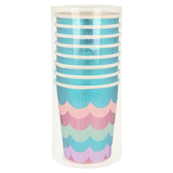 Con un elegante decoración a base de ondas en colores metalizados que recuerdan los colores de una cola de sirena. Estos vasos de fiesta aportarán la chispa brillante en cualquier mesa.