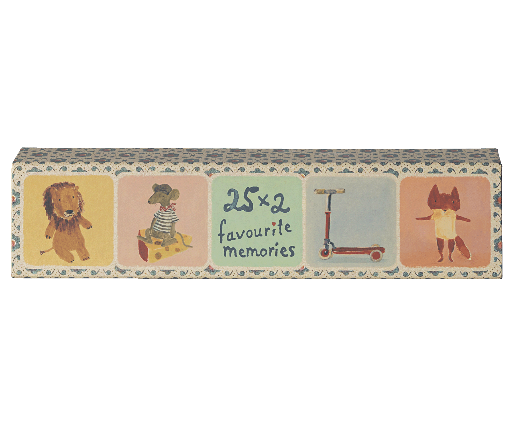 Un juego de memoria clásico con 25 ilustraciones diferentes dibujadas por Dorthe Mailil. La inspiración viene de los diferentes objetos producidos a lo largo de los años.